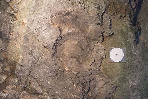 地下に大きさ60cmほどのアンモナイトが埋まっているのが見える。