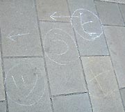 各踊り町の出し物が一堂に集まる本場所が無い時間帯は 基本的に町のあちこちで、庭先廻りをしているわけだが これが案外、場所と時間帯によっては なかなか遭遇できない。 その時のヒントになるのが、地面に書かれているチョーク。
