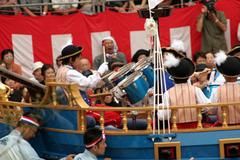 交通規制が敷かれる中、御神体をお旅所まで運ぶ。