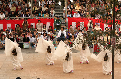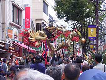 その日の会場コンサート(?)がすべて終わると、 今度はロードに出る。これを「庭先回り」と呼ぶ。 時間がなかったので庭先回りはじっくり見られなかったが、 さいわい龍踊りの庭先回りを見ることができたので、その様子を。 庭先回りだと、写真のように 見物客が大勢群がってたりするのもポイント。 龍踊りは特に人気があって、取り巻きの数がひときわすごい。